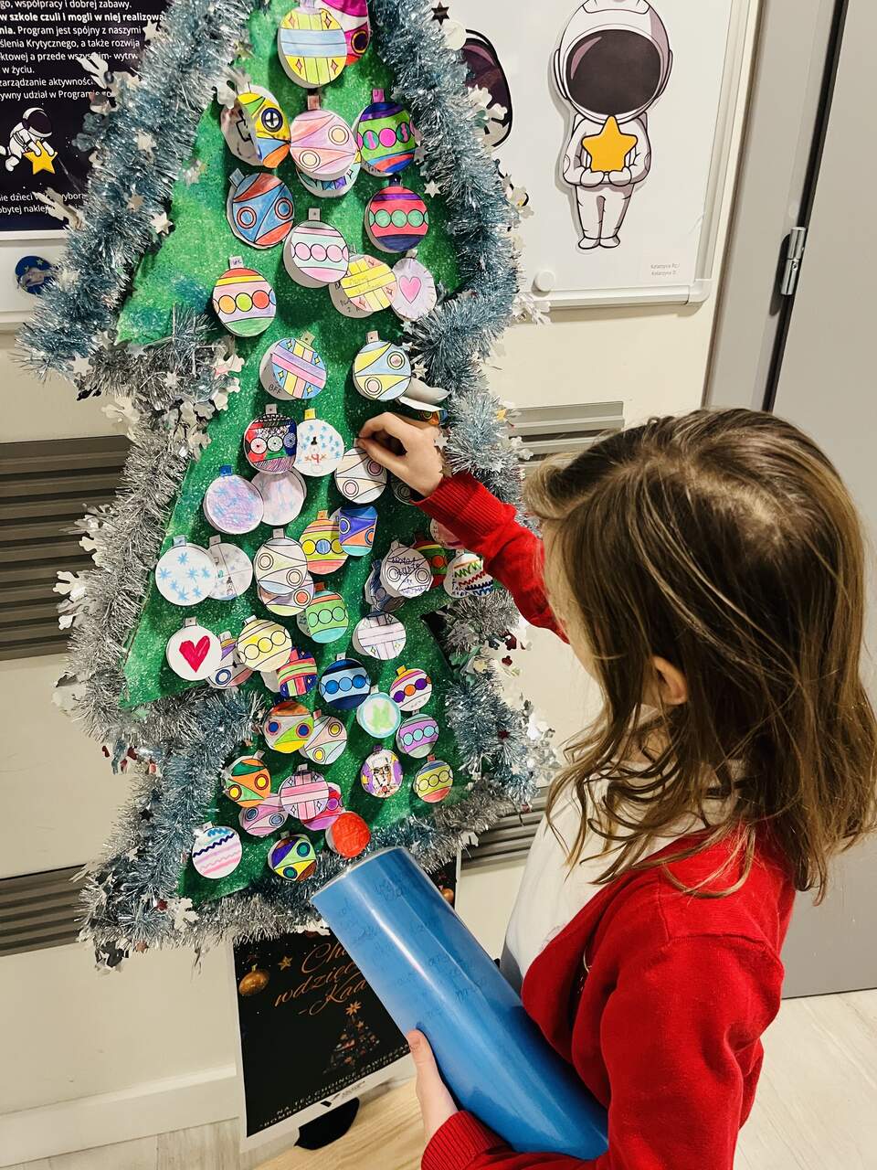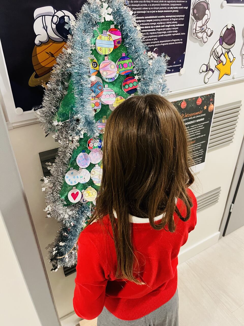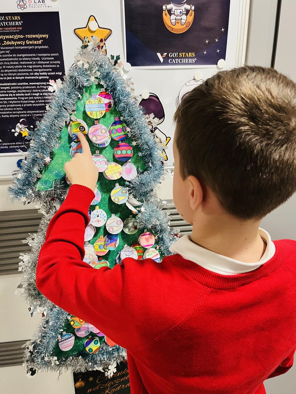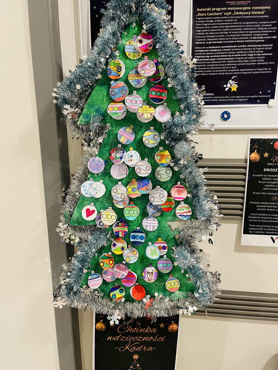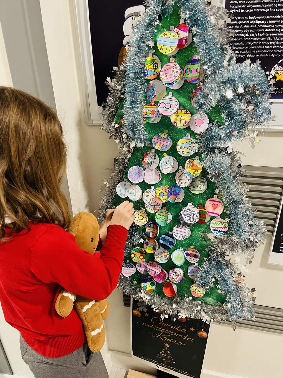 Zaprosiliśmy całą społeczność szkolną do zawieszenia na choinkach osobistych „bombek wdzięczności” – ozdób, na których uczestnicy zapisywali, za co są wdzięczni. W krótkich słowach kryły się wielkie emocje: radość, życzliwość, docenienie drugiego człowieka oraz codziennych, często drobnych chwil. Nasze choinki szybko rozbłysły setkami powodów do uśmiechu i radości. Stały się symbolem dobra, które nas łączy, oraz pięknym dowodem na to, jak wiele pozytywnych uczuć i myśli towarzyszy naszej szkolnej społeczności.